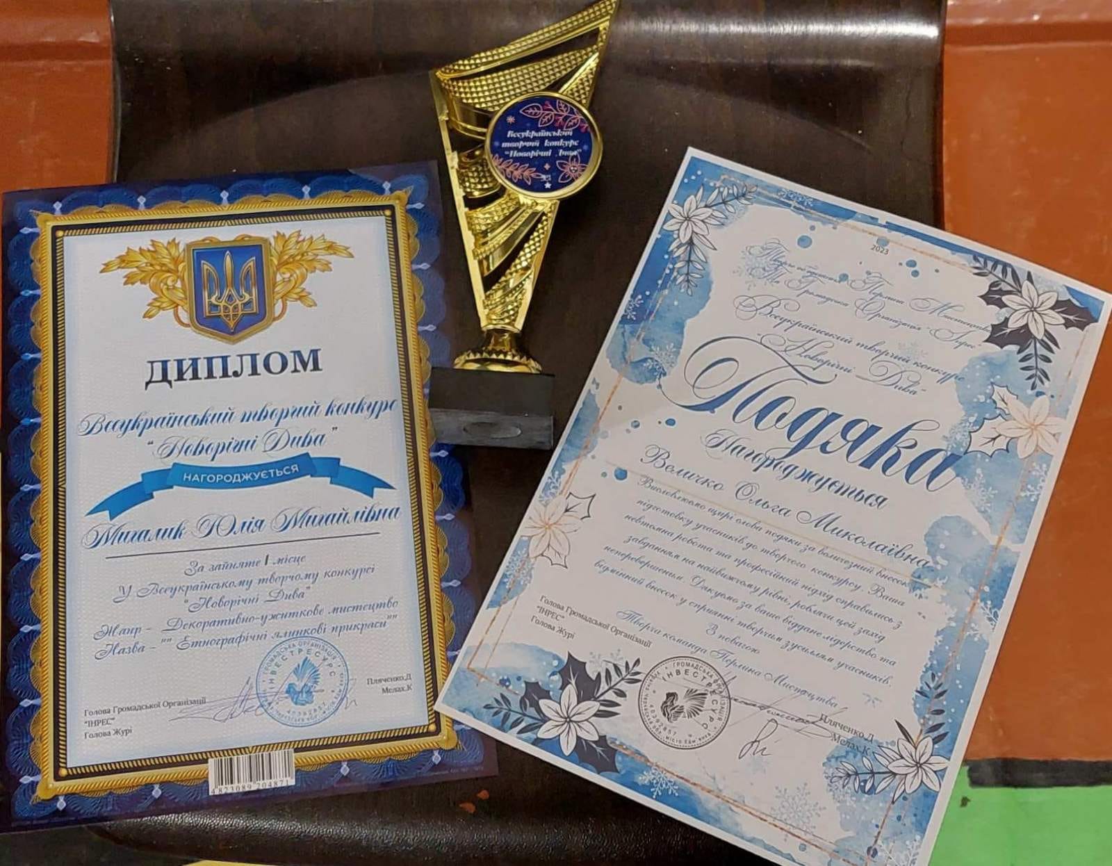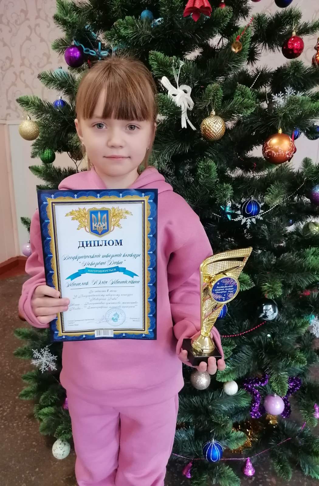 Як повідомляє Рудниківський ліцей у Фейсбуці, учениця 2 класу освітнього закладу Михалик Юлія (керівник: Величко О. М.) здобула перемогу у Всеукраїнському творчому конкурсі “Новорічні дива” у жанрі “Декоративно-ужиткове мистецтво”. Юля нагороджена Дипломом за зайняте І місце та переможним Кубком.