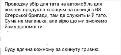 Гроші збирає для батька, який возитиме харчі для 68-ої окремої егерської бригади на передові позиції. В цій бригаді служать багато наших краян.