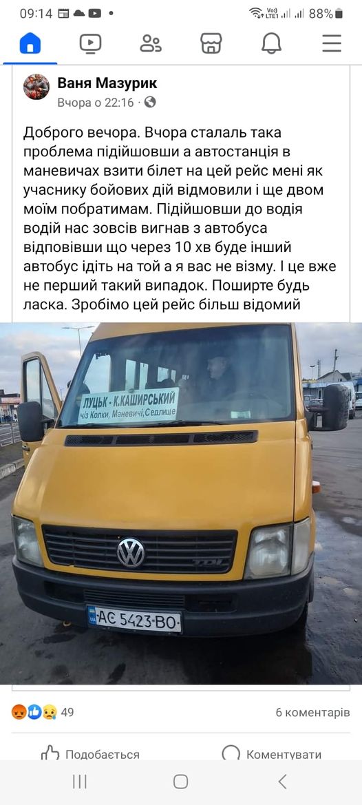 Маневичанин Олександр Турик звернувся до Волинської ОВА, аби вони звернули уваги на перевізників, які відмовляють перевозити учасників бойових дій, зокрема в Маневичах. Про це він написав на своїй ФБ-сторінці.