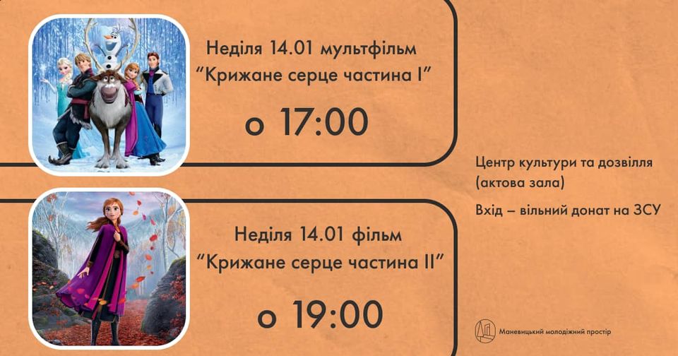 Як інформує Маневицький молодіжний простір у Фейсбуці, багато маневичан просили показати мультфільм «Крижане серце». Організатори показу з приємністю покажуть дві частини цього мультфільму.