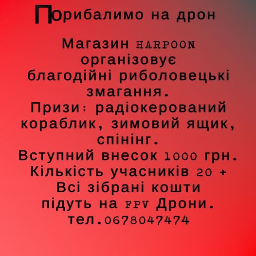 «Турнір відбуватиметься на озері Нобель 21 січня. Доставка учасників по можливості своїм транспортом. Ще можна буде заїхати бусом безкоштовно, для тих у кого немає транспорту, – йдеться у дописі. – Щоб організувалися змагання нам потрібно мінімум 20 чоловік. Тому, хто бажає і вже точно знає, що візьме участь – реєструйтесь у магазині Harpoon або за телефоном 067-8047474. Призи надає мережа магазинів Harpoon.