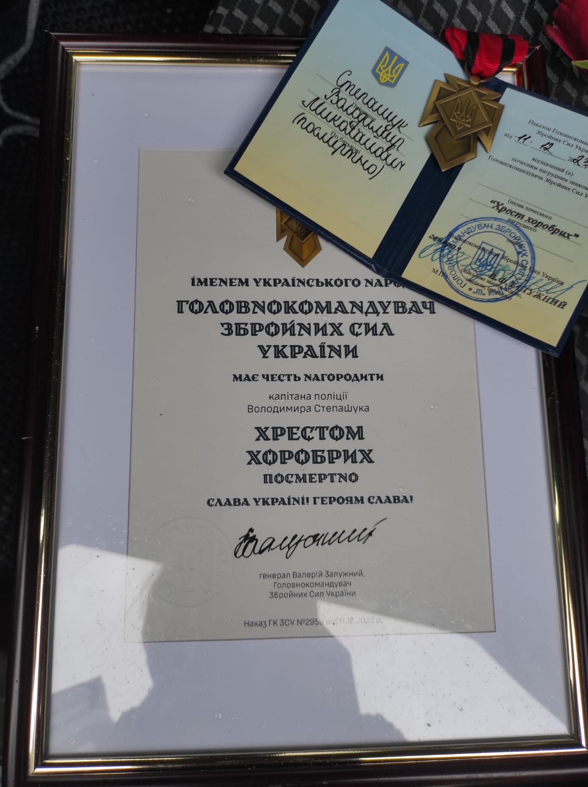 Володимир Степашук мужньо боронив рідну землю та загинув 13 вересня 2023 року, виконуючи бойове завдання на Донеччині. Нещодавно наказом Національної поліції України бійцю присвоєно спеціальне звання майор поліції (посмертно).