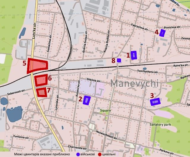 3. Військовий поліконфесійний цвинтар солдатів німецької та австро-угорської армій з часів І світової війни знаходився поблизу сучасного стадіону. Він був зруйнований у 1980-их роках під час будівництва в цьому місці підстанції і адмінбудинку Маневицького району електричних мереж. Жодних ознак меморіалізації на місці немає.