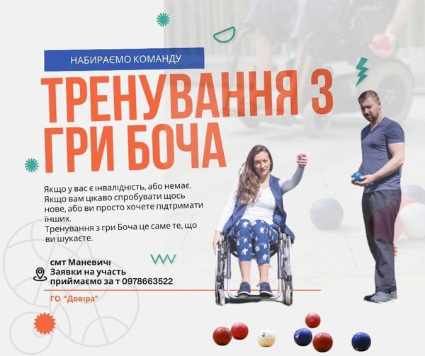 «Проводимо набір учасників на тренування з гри Боча! Упродовж чотирьох місяців ми плануємо: проводити заняття на постійній основі, організовувати тренування для всіх охочих, займатися спортом, щоб це стало доброю звичкою, покращити свої навички в грі Боча, допоможемо покращити свій фізичний та емоційний стан, що дуже важливо під час війни», – йдеться у дописі Громадської організації «Осіб з інвалідністю”Довіра”» у Фейсбуці.